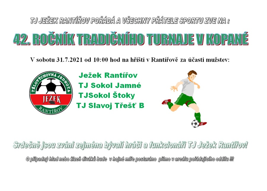 42. ročník tradičního turnaje v kopané se uskuteční v sobotu 31.7.2021 v 10h na hřišti v Rantířově.