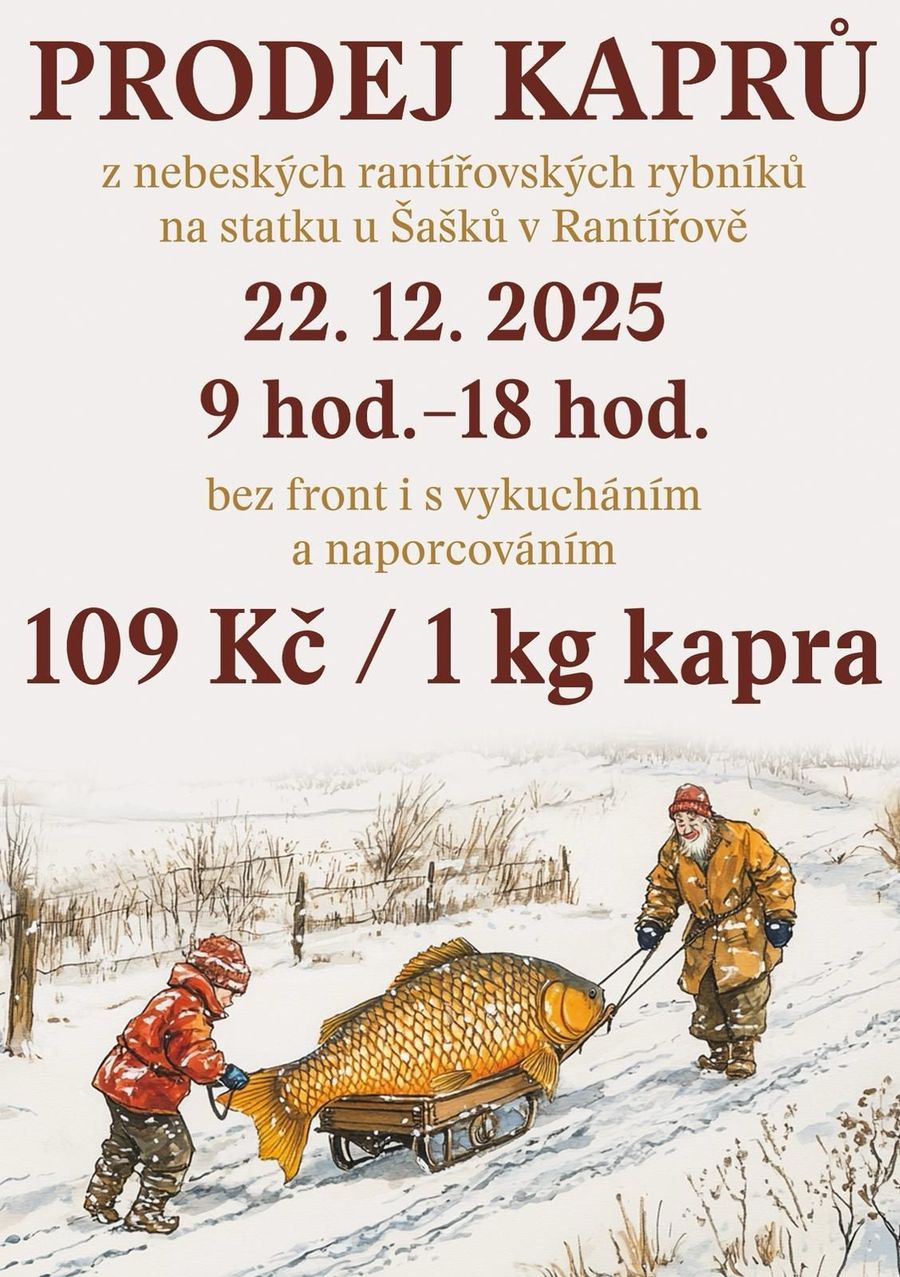 Prodej kaprů na statku u Šašků v Rantířově bude probíhat 22.12. 2025 od 9 do 18h.