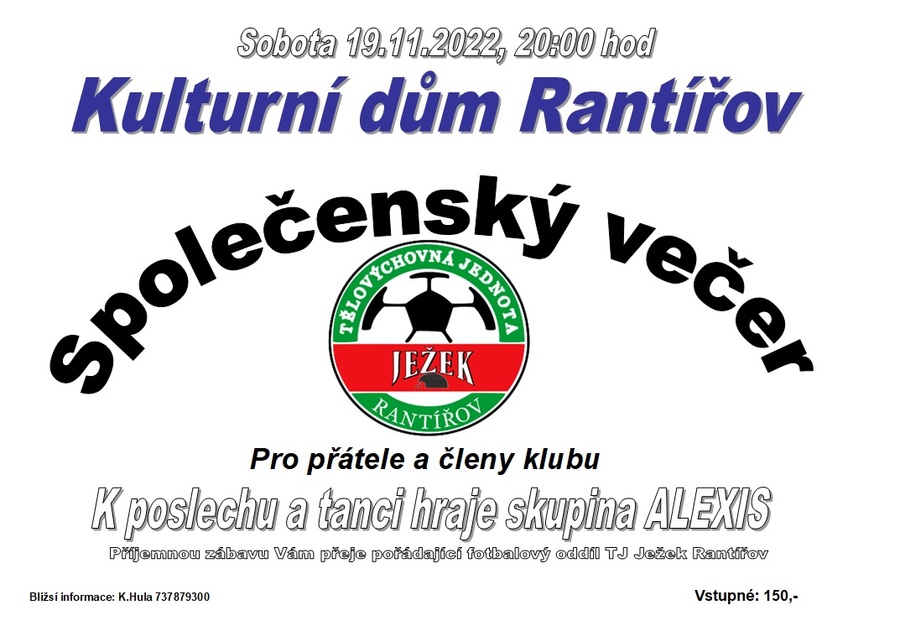 Společenský večer v KD, hraje skupina Alexis, 19.11.2022 od 20h, srdečně zve TJ Ježek Rantířov.
